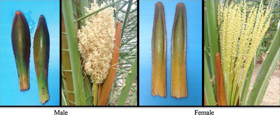 꽃 : 싹이 터서 5년쯤 되면 봄철에 황백색의 작은 꽃이 피고 많은 열매가 달린다. 자웅이주(암수딴그루), 원래 자연적으로 바람에 의해 수분 되지만, 오아시스 원예와 현대 상업 과수원에서는 수작업으로 완전히 수분된다. 수나무 한 그루는 최대 100그루의 암나무에게 수분 할 수 있다. 일부 재배자는 수나무를 유지하지도 않는다. 수꽃은 수분 시간에 현지 시장에서 구입할 수 있기 때문이다. 숙련 된 작업자가 사다리에서 수동 수분, 또는 바람 기계를 사용하여 수분한다.